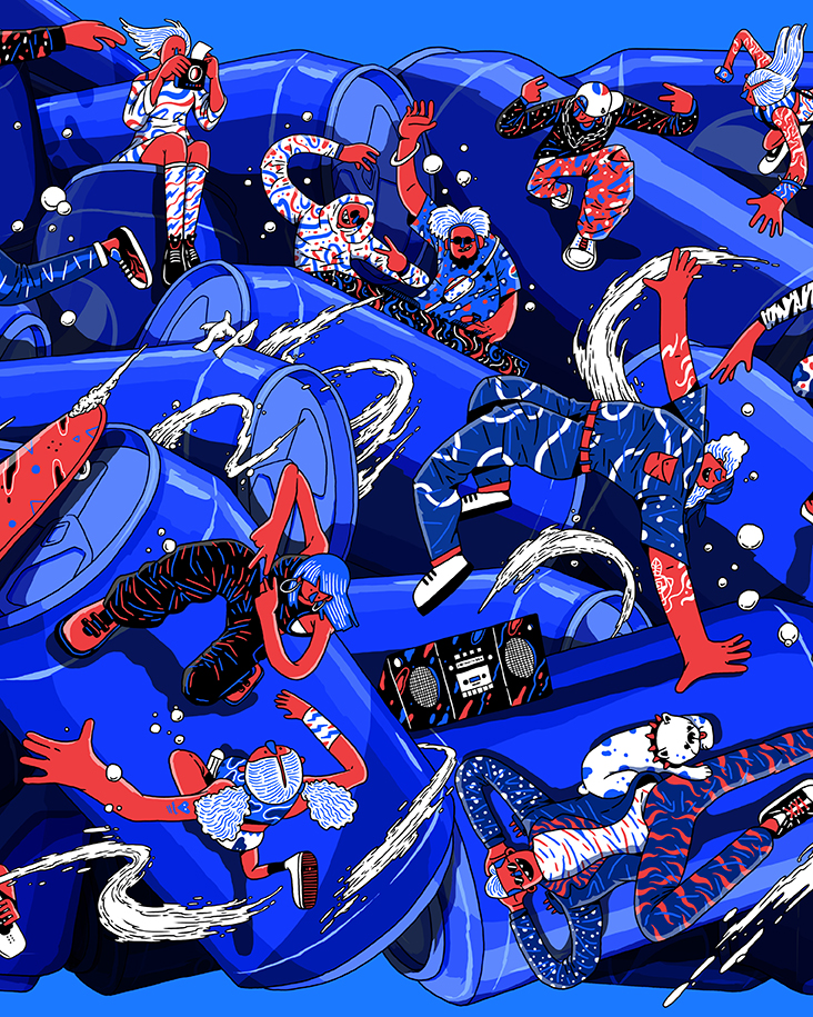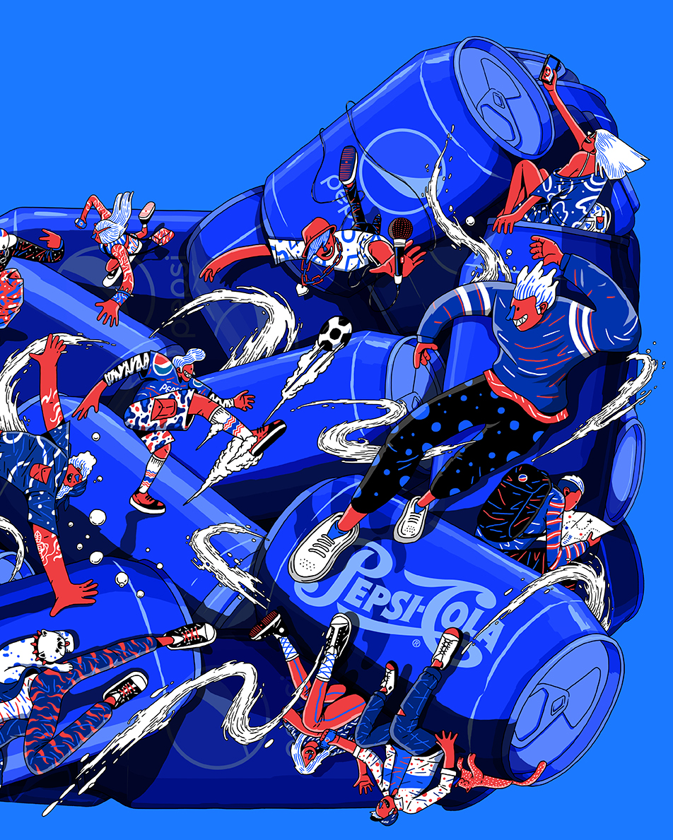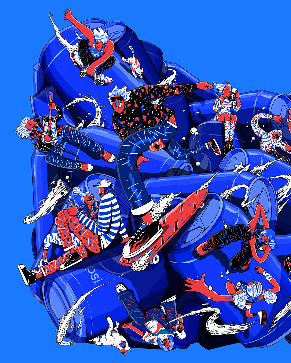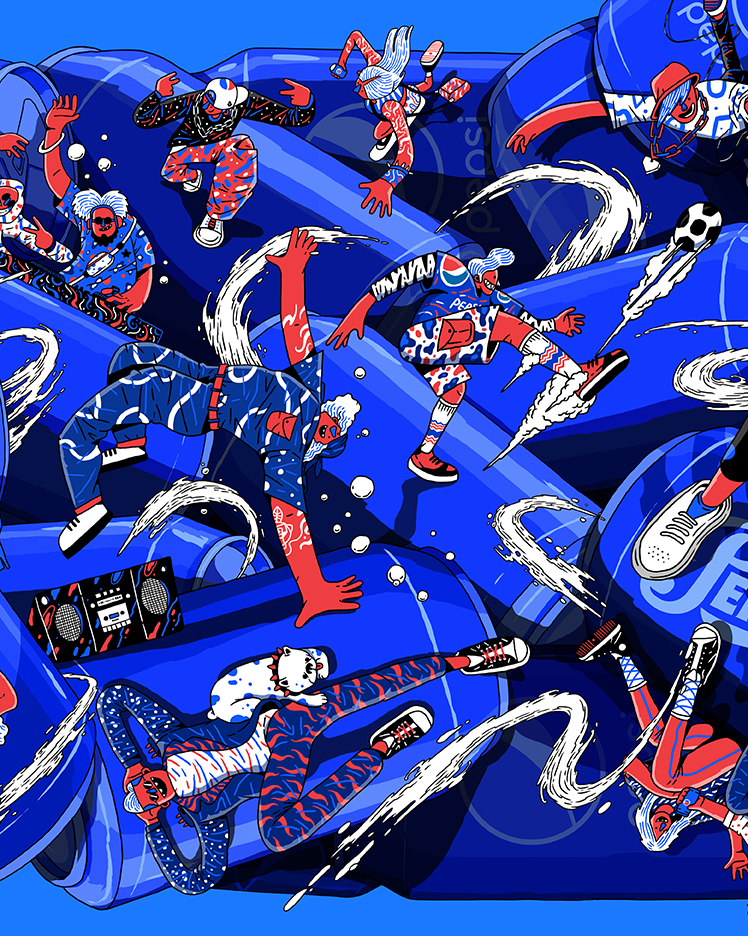 We commissioned Ken Wong, an illustrator with a creative background to execute our idea for an all-angled vibrant life with Pepsi. We first explored a couple of rough ideas, and we settled with a multi-dimensional platform through multi-angled cans of Pepsi packed together with a diversity of Pepsi characters interacting on top of it.