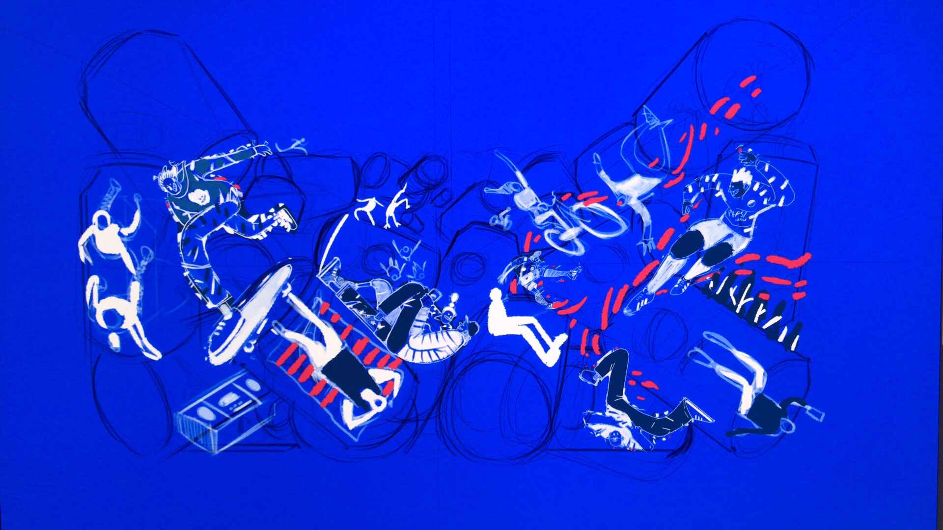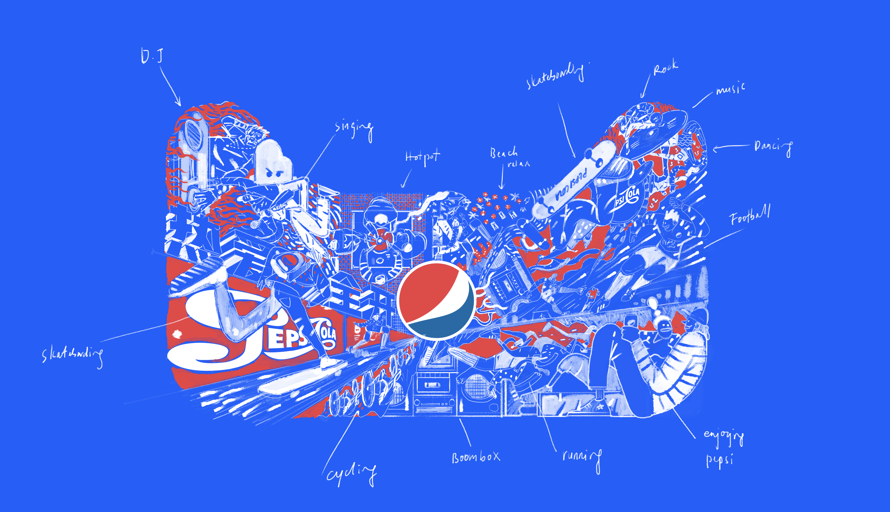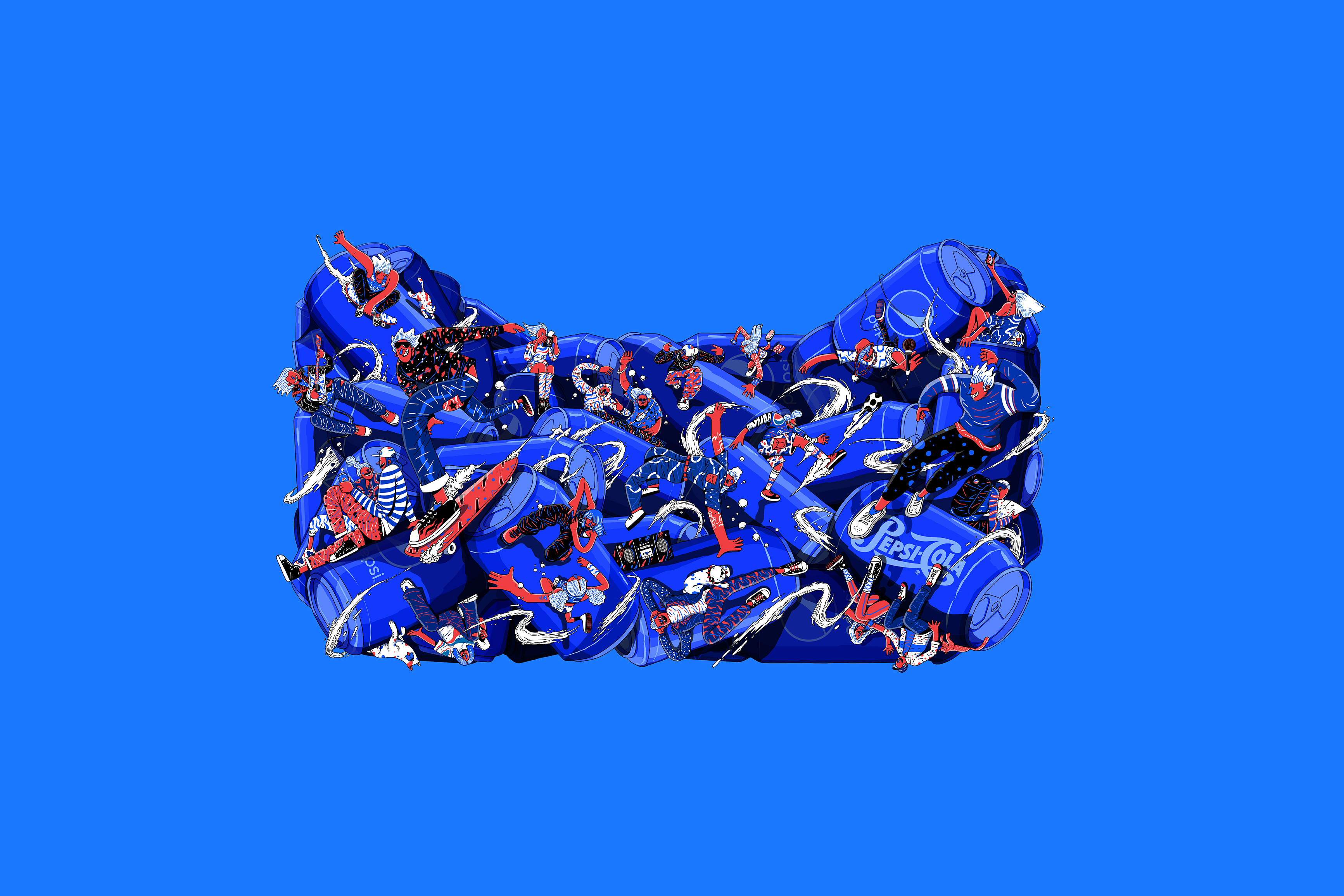 We commissioned Ken Wong, an illustrator with a creative background to execute our idea for an all-angled vibrant life with Pepsi. We first explored a couple of rough ideas, and we settled with a multi-dimensional platform through multi-angled cans of Pepsi packed together with a diversity of Pepsi characters interacting on top of it.
